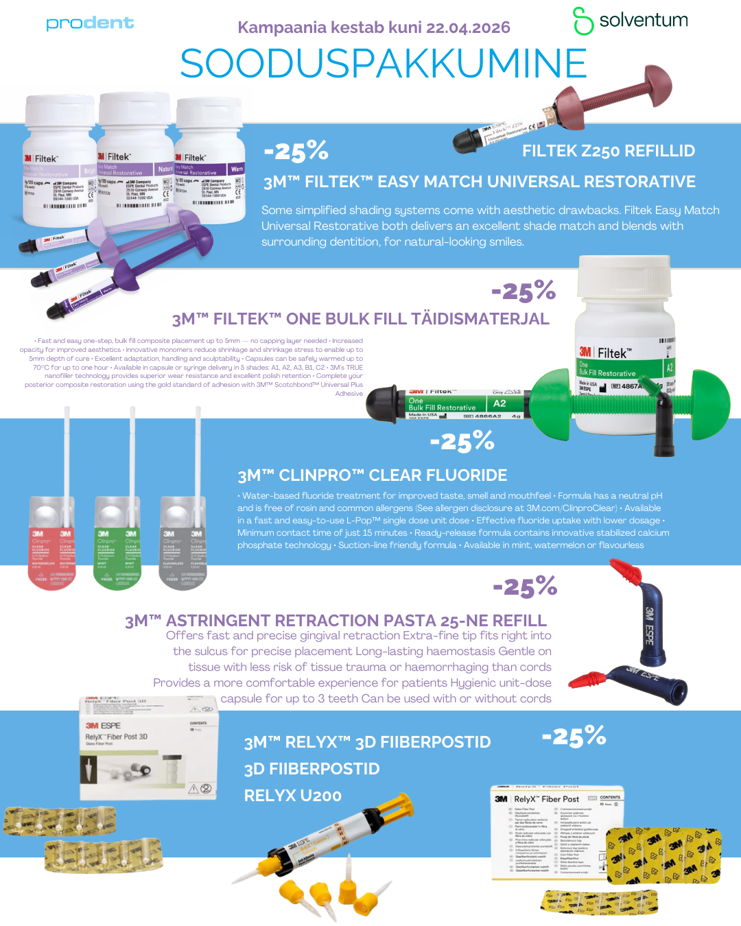 3M Espe, Pakkumised Solventum sooduskampaania kuni 22.04.2026 Posted on 4. märts 2026 by Liina Lelmi 04 märts Liina Lelmi Uus: Solventum™ Filtek™ Easy Match Flowable Restorative kuni 31.03 soodustusega -30%